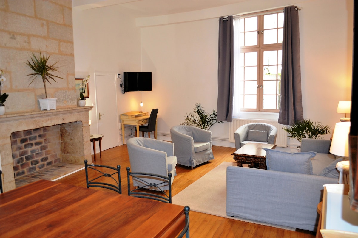 Gites du Vieux Moulin - Apt « Noyer » Authenticité & Confort certifié*** 7 couchages Emplacement exceptionnel : • à 50 m de la cathédrale permettant un accès à pied à tous les commerces et les lieux de culture • au calme et au frais dans une rue tranquille • au pied de la cathédrale (avec vue) Entièrement rénové : • 2 chambres • Grande pièce à Vivre avec : o Salon (canapé convertible, fauteuils) o Salle à manger o Cuisine équipée o Bureau • Wifi TV Box, NETFLIX • Vélos à disp