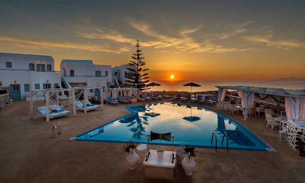 Villa Danezis can be found in the middle of Santorini Island near the main highway in the area of Messaria village, which is 3 kilometres (5 mins drive) from Fira the capital. The hotel’s central location gives the visitor easy access to Santorini’s most well known areas & local attractions – the beaches, archealogical sites, shopping areas and nightlife. Villa Danezis offers comfort & relaxation in a family environment. There is a large swimming pool & sunbathing area with umbrellas & sunbeds.