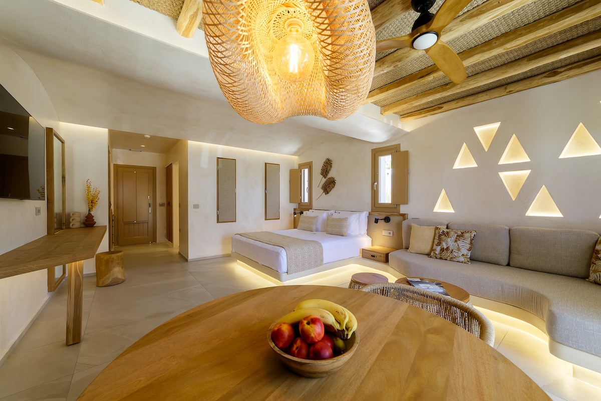 The luxurious poolside DELUXE ROOM with pool view is a well-decorated in Cycladic colors spacious room-size suite that can host up to three persons. The warm interior design with minimal architecture in white style includes all the high-end services for a pleasant accommodation. The room consists of one bedroom with a traditionally built-in style double bed, one bathroom with shower, a living room with sofa-bed and a fully equipped kitchenette. There is also a beautiful patio outside the room.