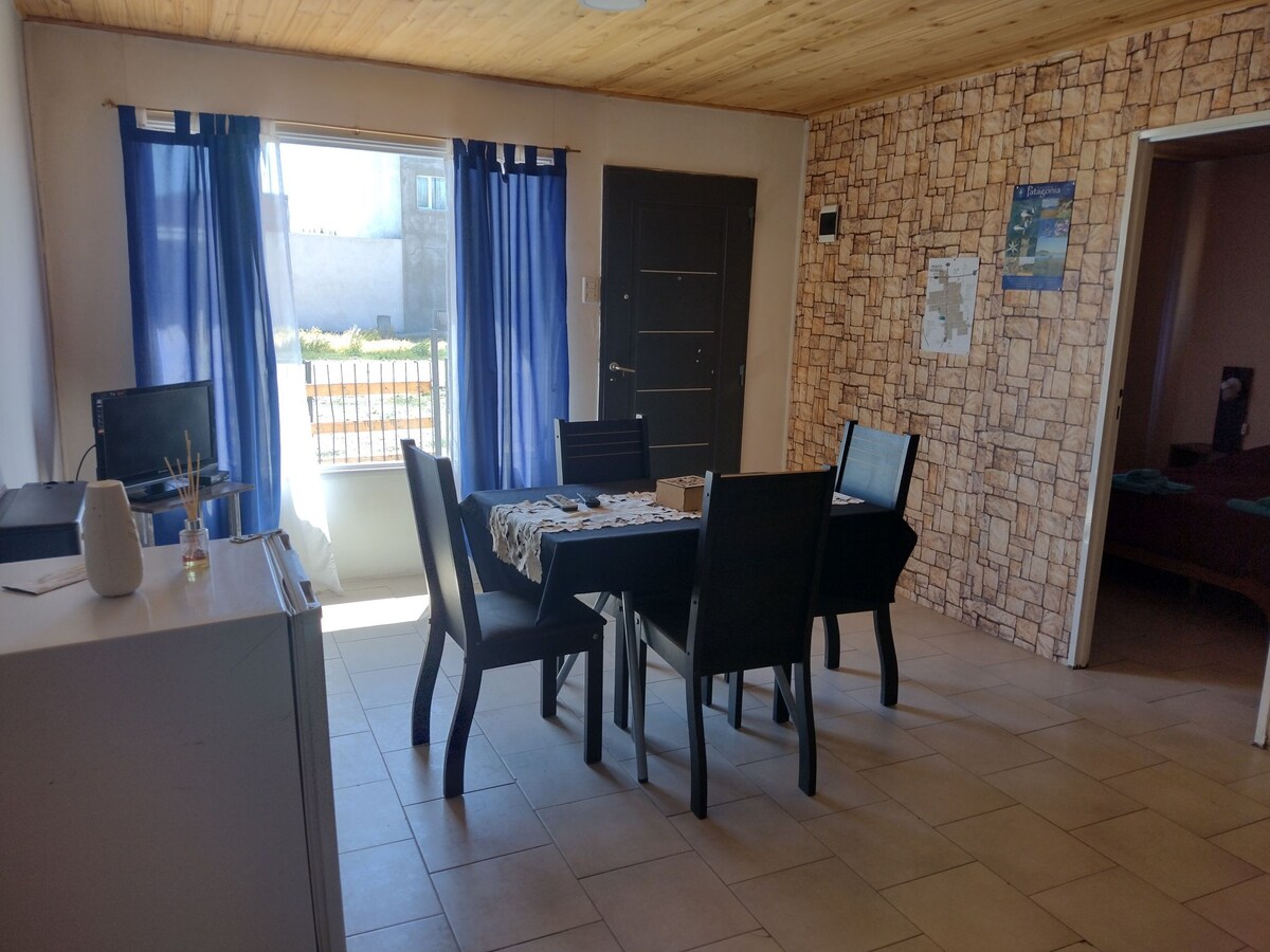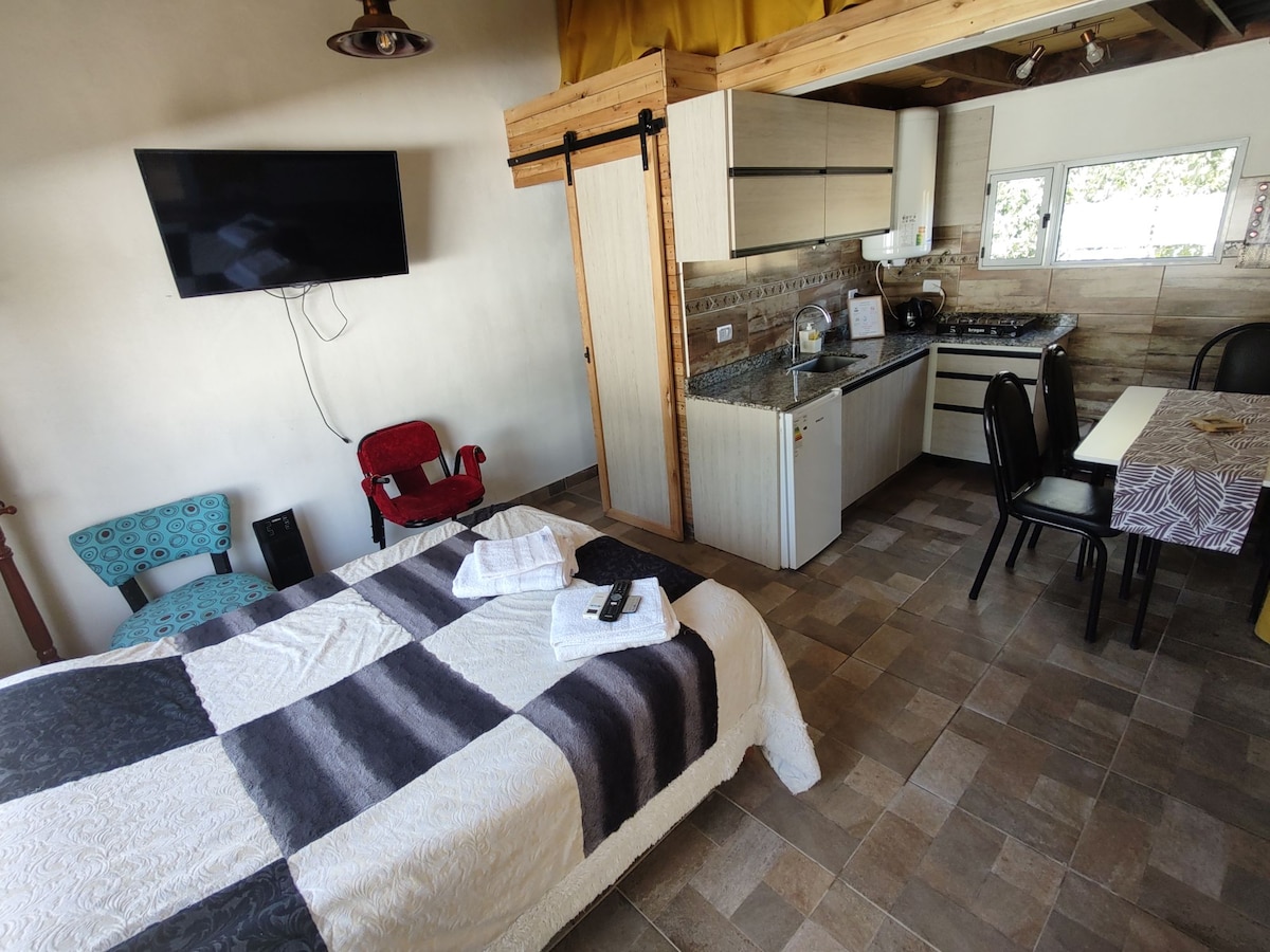 Hermoso monoambiente a 1 cuadra de la terminal de ómnibus, 300 mts del banco Nación, 400 mts de La Anónima. Dpto a estrenar con Smartv 50', WiFi, Directv prepago, patio, parrilla, estacionamiento, cocina equipada, salamandra, ropa de cama y toallas. Pet friendly!