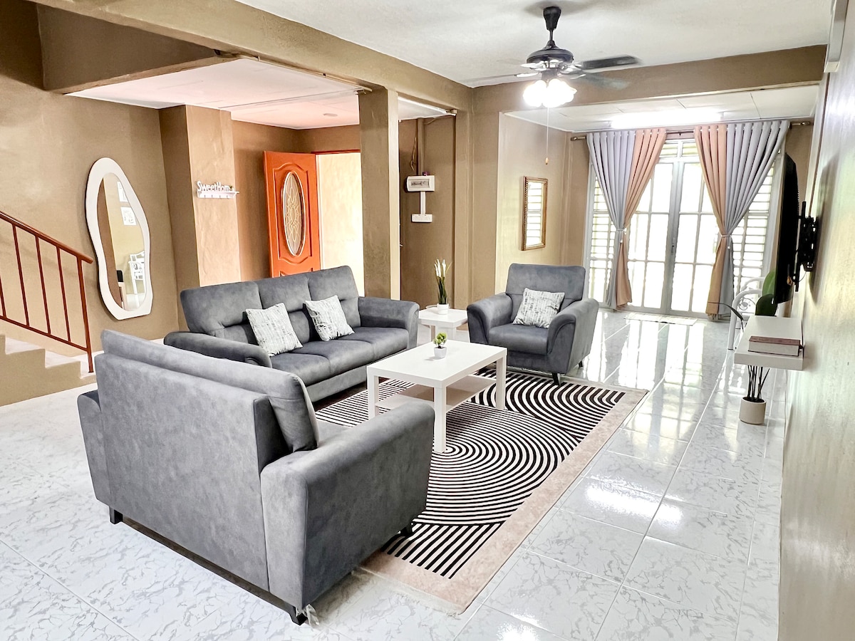 🛏️ 3 Bedrooms - Queen beds - Air conditioning - Fans 🛀 2 Bathrooms (Water Heater) - Master bedroom - 1 near kitchen 🛋️ Living Room - Sofa - 3 fans - Prepaid air conditioning (pay-as-you-use) - TV with MYTV and YouTube 🍳 Kitchen - Coway water filter - Iron and ironing board - Soap and shampoo - Dining table - Refrigerator - Oven and rice cooker - Electric stove 📶 Free WiFi 🔌 Iron and ironing board 🧼 Soap and shampoo provided 💶 Toto Set (1 Toto, 1 blanket, 1 pillow) - RM5