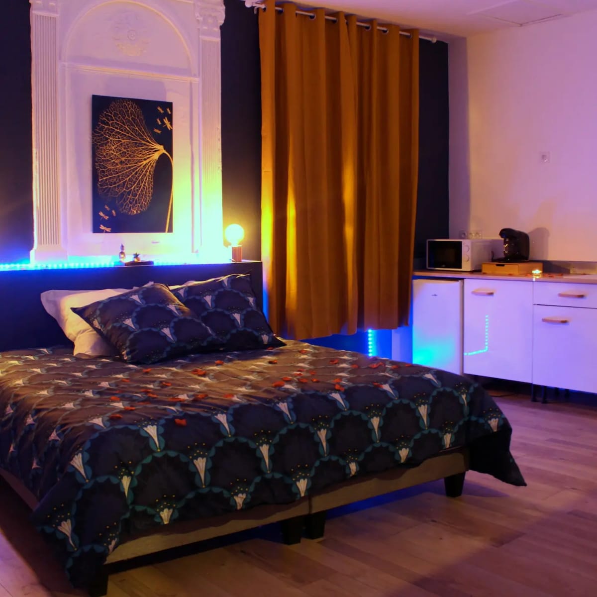 ✨ Bienvenue dans la Suite Multiverse Entrez dans un monde parallèle où chaque détail vous transporte. Des écrans dissimulés en fausses fenêtres diffusent des paysages mouvants, créant l’illusion de voyager entre mer, forêt, ville futuriste ou ciel étoilé. L’ambiance sonore et lumineuse s’ajuste pour vous plonger pleinement dans l’univers choisi. ☕ Le petit déjeuner est inclus et livré directement en chambre via une trappe discrète, pour un réveil tout en douceur.
