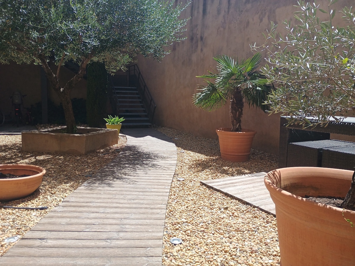 Extrêmement bien situé, le logement se trouve à 5 min de l'autoroute, dans un lotissement très calme, sans aucun vis à vis à 10 min à pied du centre d'Orange où vous trouverez le magnifique Théâtre Antique, restaurants, boutiques et les animations de la ville. Vous séjournerez dans une suite au style scandinave à l'intérieur et tropical à l'extérieur. La chambre dispose d'un jacuzzi et d'une terrasse extérieure. Il y a tout le confort indispensable pour passer une nuit d'exception.