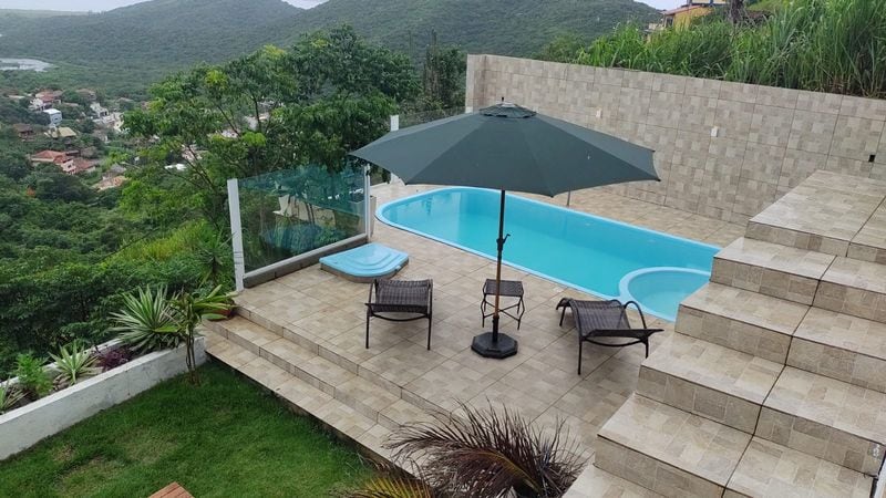Aqui, a vista é de tirar o fôlego, porque estamos em um dos pontos mais altos de Cabo Frio! Nossa piscina é um espetáculo (apenas da nossa propriedade - apenas 2 chalés) e a praia do Peró fica a apenas 13 min daqui. Nossa hospedagem é SMART, com conexão à Alexa e TV conectada com principais streamings. Cercada de mata preservada, você viverá dias de muito sossego, relaxando na rede, piscina ou sofá. E o super café da manhã Maldivas pode ser servido no quarto ou piscina (contratado a parte).