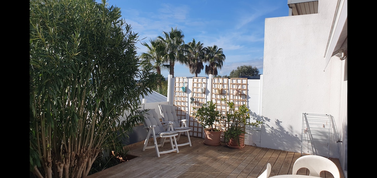 superbe maisonnette sans vis a vis . Maison 45m² plus jardin privatif 35m² Située à 100 m de la mer Dans un quartier résidentiel calme Chambre avec 2 lits double Cuisine-salle à manger- salon avec BZ Salle de bains avec WC Equipements : Micro-onde, four, machine à café Senseo et cafetière filtre, machine à laver Climatisation Internet, TV, lecteur dvd Planche et fer à repasser Jardin ombragé avec barbecue, salon de jardin, bains de soleil 2 vélos adultes