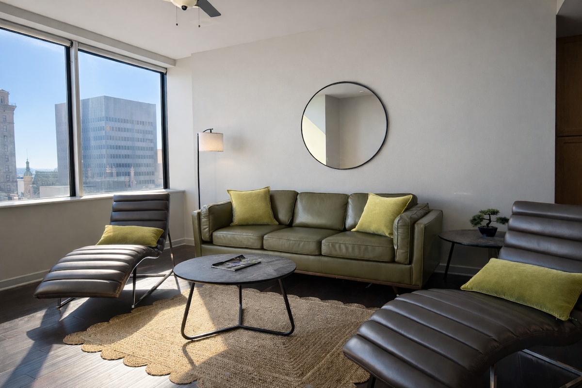 Experience the best of city living in our modern minimalist retreat! Pets Stay Free Enjoy breathtaking views of the city skyline from the comfort of our sleek and stylish high-rise apartment. Located in the heart of downtown, you'll be steps away from top attractions, trendy restaurants, and vibrant bars. Our apt. is the perfect haven for couples, solo travelers, and business professionals seeking a stylish and convenient base for their city adventures.