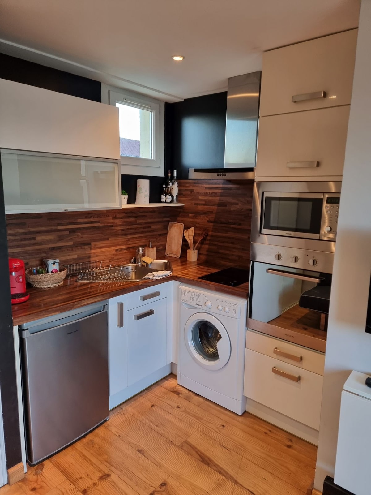 Appartement duplex situé entre la gare et le centre avec jardin et piscine privée séjour cuisine fermée, deux chambres, une grande salle de bain et une salle d'eau avec deux toilettes. La salle de bain dispose d'une baignoire balnéo pour deux personnes et d'un coin détente avec fauteuil chauffant et massant. Vous aurez accès a un jardin privé avec jacuzzi extérieur, un espace pour manger dehors avec piscine privé. Un emplacement pour garer plusieurs voitures est juste devant l'appartement.