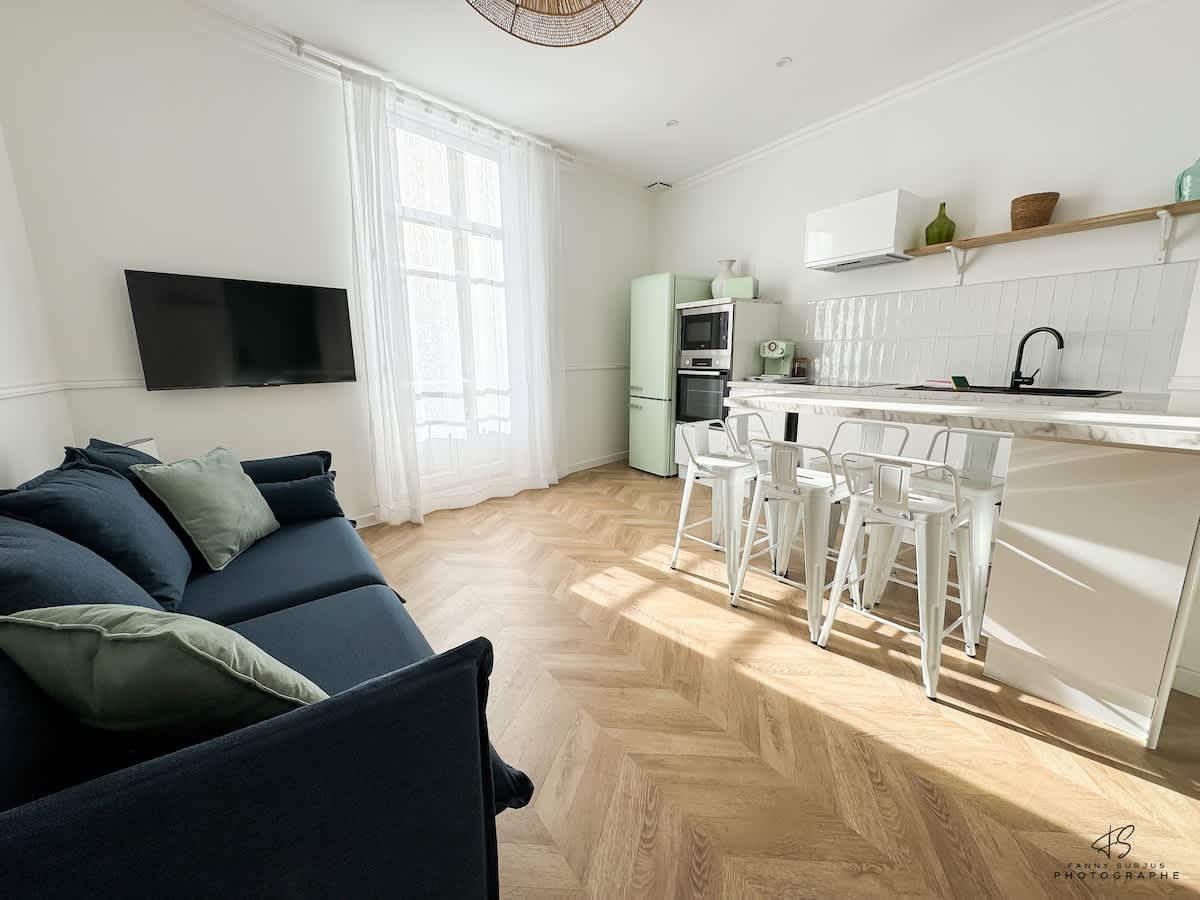Appartement situé dans le quartier Saint Martin, il se compose d'un grand salon séjour avec cuisine ouverte de deux chambres, d'une salle de bain avec baignoire balnéo et un toilette séparé. Vous aurez accès a un petit balcon. Il est possible de se garer dans la rue gratuitement ou un parking gratuit est à disposition à 2min à pied. Dans un secteur tranquille à 20 min des stations balnéaires et 10 min du centre ville et de la gare vous serez à proximité d'un centre commercial également.