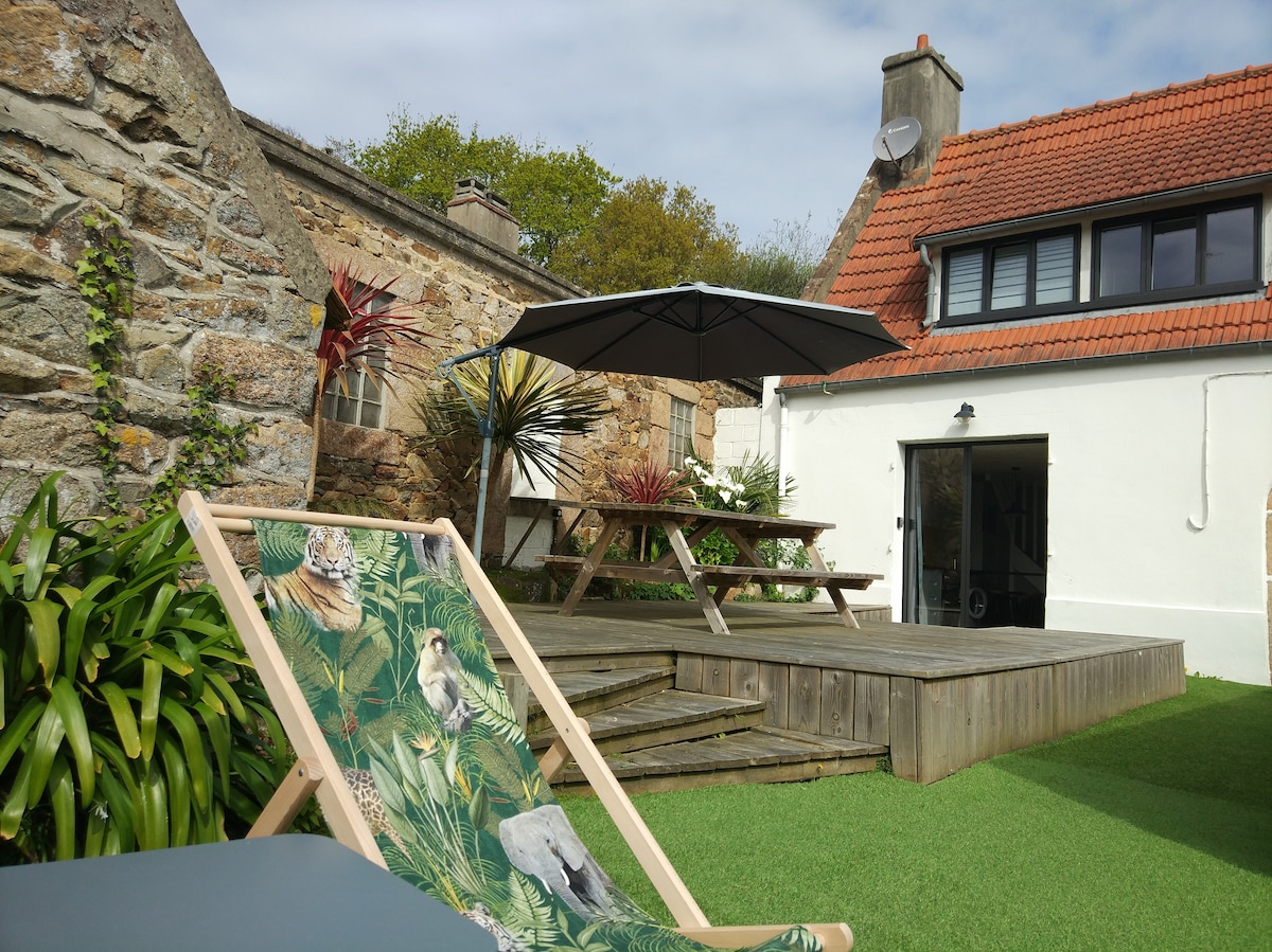 Studio attenant à jolie maison Bretonne avec terrasse Il se compose d'un espace salon, coin cuisine ainsi que d'une salle d'eau (douche et toilettes) au rez de chaussé. La grande chambre à l'étage est accessible par un escalier. Elle est composée d'un lit de dimension 160x200, rangements, petit canapé et TV. Espace extérieur accessible avec mise à disposition d'un salon de jardin.
