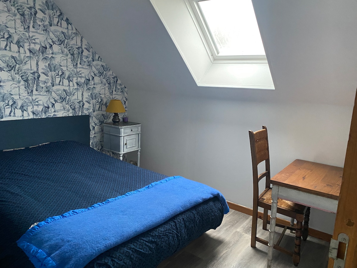 Vous voulez vous ressourcer à la campagne à 5 ' des bois et 25' de la mer chambre 1: 1 lit de 140 avec 1 commode, 1 bureau, 1 tabouret et 1 fauteuil. La penderie se trouve dans le couloir face à chambre. les WC et la salle de bain sont commun au 2 chambres.