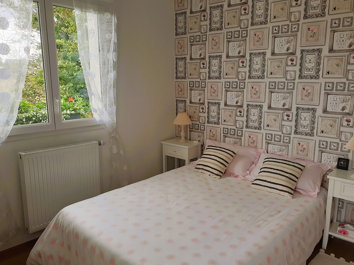 Séjournez dans une chambre au style "champêtre chic", au calme, redécorée en 2019. La salle d'eau est attenante et vous y trouverez le nécessaire de toilette ainsi qu'un sèche cheveux. Profitez du jardin avec vue mer, de sa table de pique nique à 5 mn de la plage de sable fin et du GR 34.