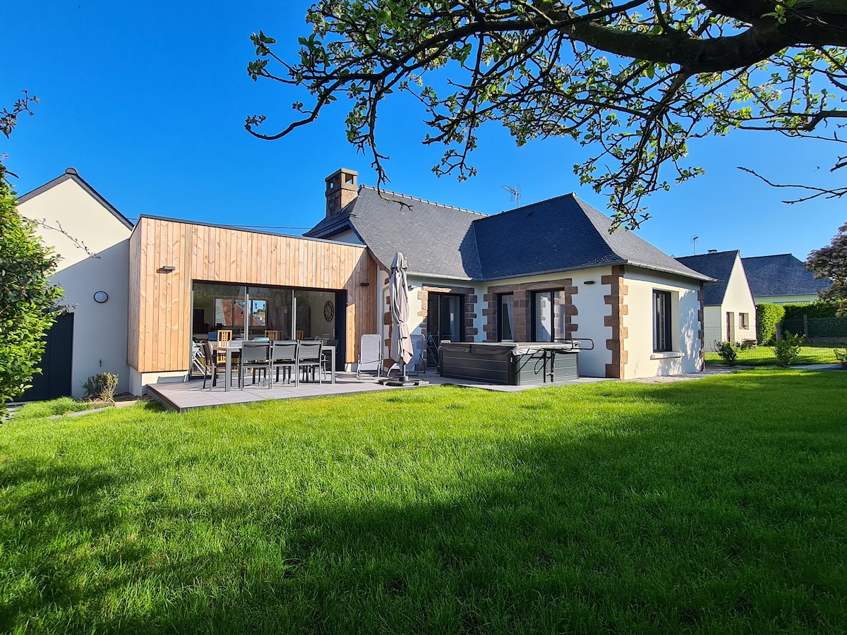 Venez passer d’agréables vacances en Finistère à Plougasnou, avec cette charmante maison avec vue sur mer, entièrement rénovée en 2020 . Maison tout confort idéalement située, plage du Guerzit à 10 min, bourg de Plougasnou à 4 km, grand jardin clos et arboré, grande terrasse avec Jacuzzi exposée sud ouest.