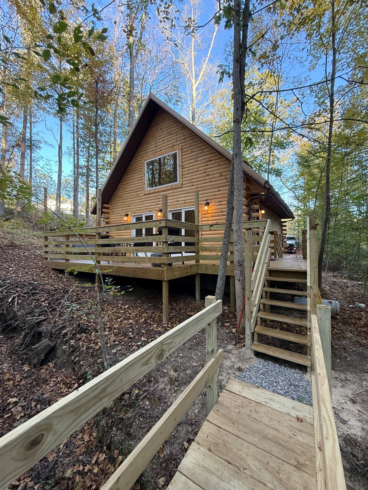 Secluded NEW two bedroom one full bath cabin in the woods. One Mile Lodge is located just 20 minutes out of The Hocking Hills! This secluded cabin sleeps four with two queen beds, one full bath, a full kitchen, and a private 4-person hot tub. This 25-acre property includes a mile-long trail that goes fully around the entire property through the woods and pond located behind the lodge. Our lodge includes high-speed Wifi, a smart TV, a Keurig, a propane grill, and outdoor seating.