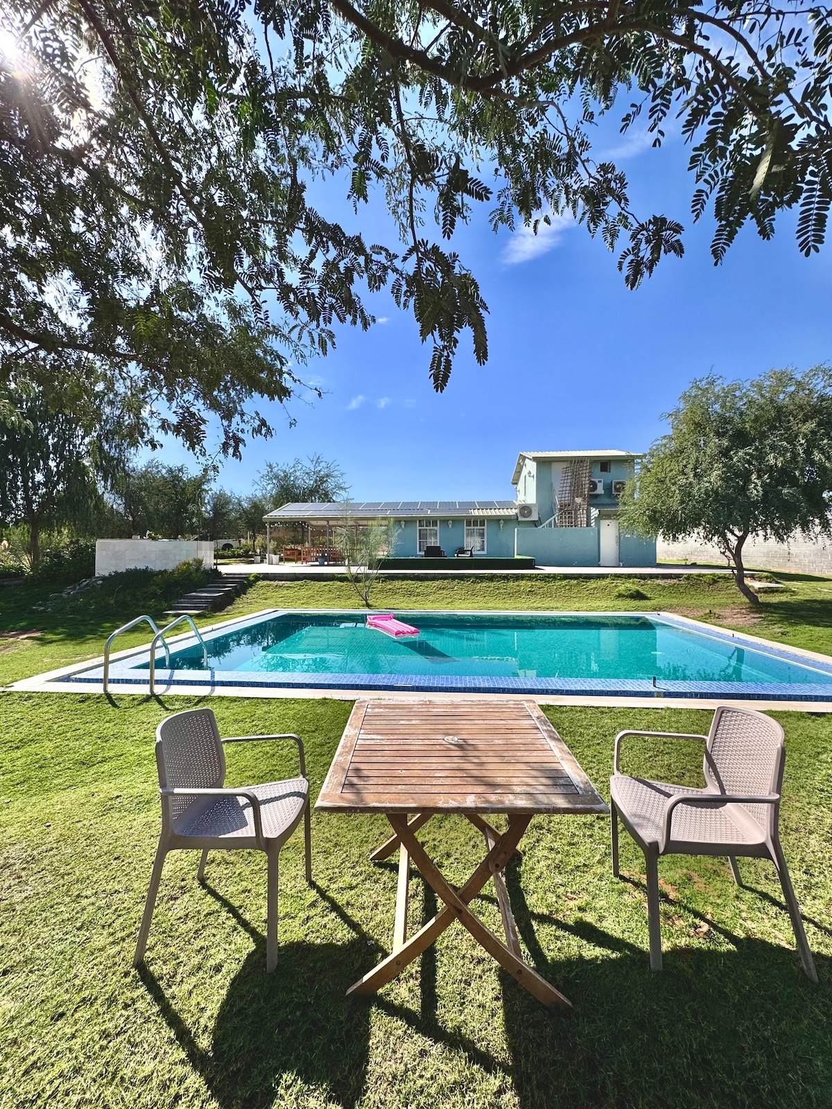 Enjoy a quiet stay in a beautiful house on a private farm surrounded by trees and green spaces with a private pool . The place is ideal for families and those seeking to relax away from the hustle and bustle of the city. The house is fully equipped (3 comfortable rooms, kitchen, outdoor seating, grill). Close to services and main roads, it’s an easy drive from dubai ,it offers a great view of nature. An authentic rural experience with luxury and comfort in the middle of the desert