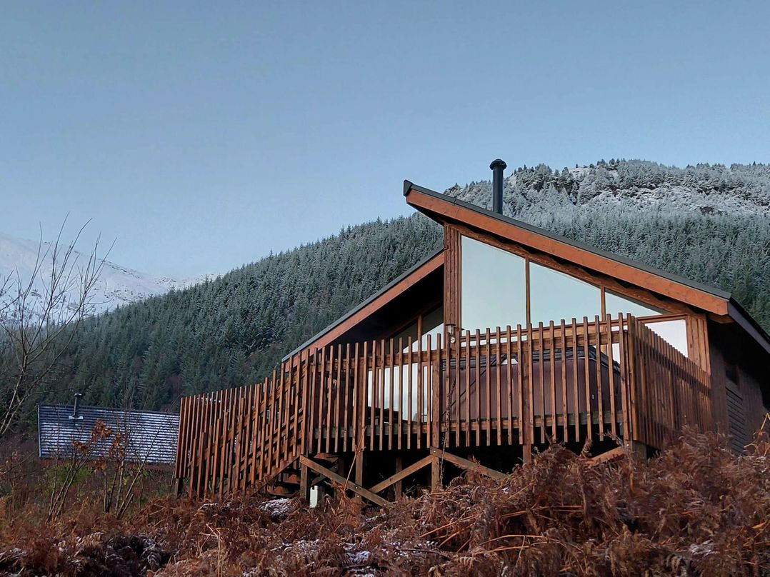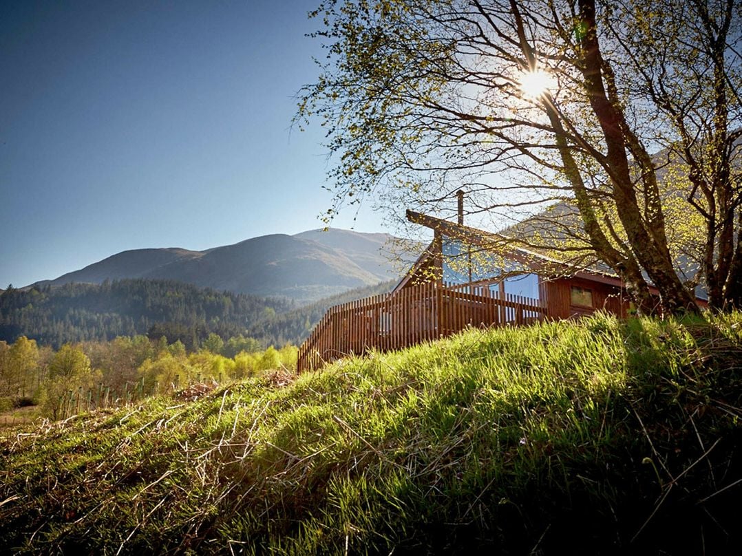 Strathyre Golden Oak Hideaway Lochside: romantic cabin for two in Strathyre mountains. Loch Lubnaig views, freestanding bath, log burner, hot tub. Nearby trails, local dining, on-site activities.