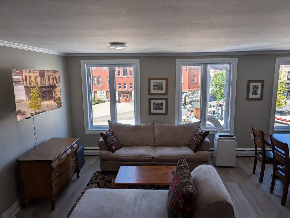 Perfect space for families visiting loved ones or the working professional. Located in the heart of downtown St. Mary's, is a luxury two bedroom condo with 12 foot ceilings, four huge windows with stunning views of downtown in a historic limestone building. Experience all that St. Marys has to offer, steps away from charming downtown shops, beautiful walking trails, and the scenic Little Falls. Only a 20 minute drive to Stratford, home of the Stratford Festival and wonderful culinary scene.