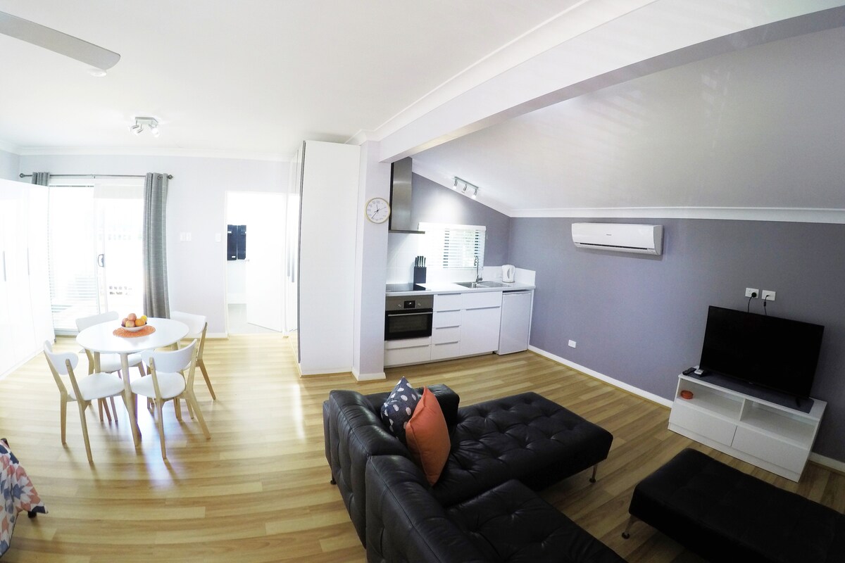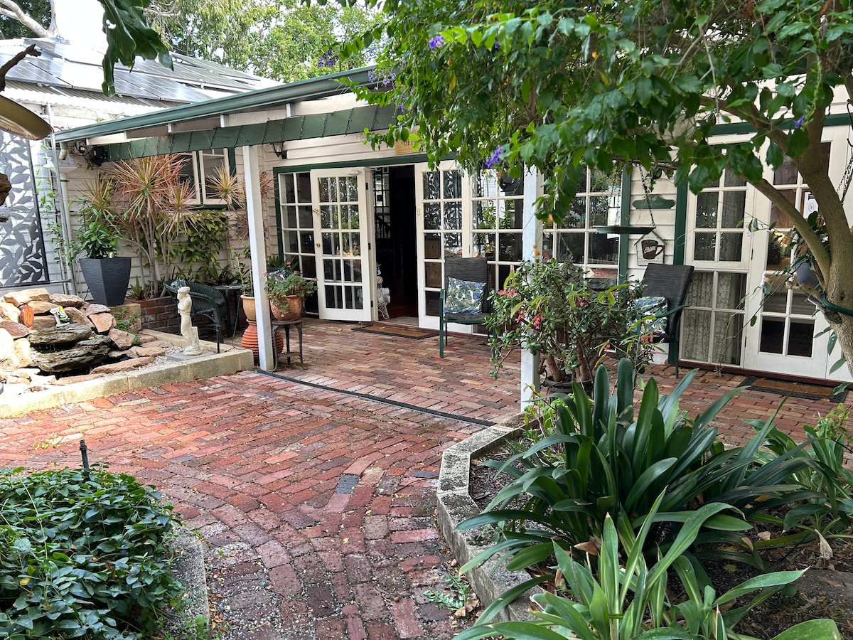Take it easy at this unique and tranquil getaway. Guests have their own entrance to the downstairs Studio and your hosts live on the premises above ( You may hear the occasional footsteps !) Close to the bus and train or a 12 minute walk to the beach. Shared access to a beautiful garden where you can enjoy your morning coffee. An abundance of shops cafes and restaurants are within walking distance. Both the Regis Aged Care facility and the Guildhall Wedding venue are a few short minutes away.