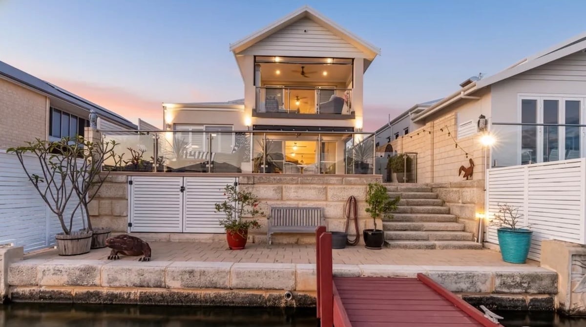 Quiet retreat to enjoy a family holiday in this new Hampton style home with a 7m private jetty and kayaks. Suitable for children over 5 years of age. NO PETS allowed. Work from home away using the work space; printer and wi-fi. Bring your boat, ramps nearby and 5 minutes to Mandurah city and waterfront with plenty of great restaurants and cafes. Situated in a quiet neighbourhood at the end of the canal ; wine and dine enjoying the sunset and view with a bbq in the alfresco.
