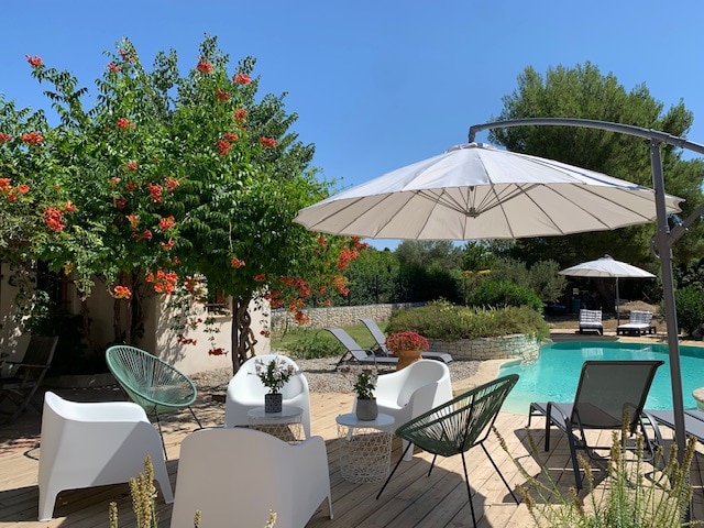 The building, an authentic Provencal farmhouse, was built on a huge 1.6-hectare estate among olive trees and orchards. Your independent cottage is located in a private West wing. The East wing is occupied by the owners as the farmhouse is conceived to assure each its confort and intimacy. You have a separate entrance with gate and a car park up to 4, private garden with a spa and your own heated pool. You have also access on the property to many amenities to enjoy your stay
