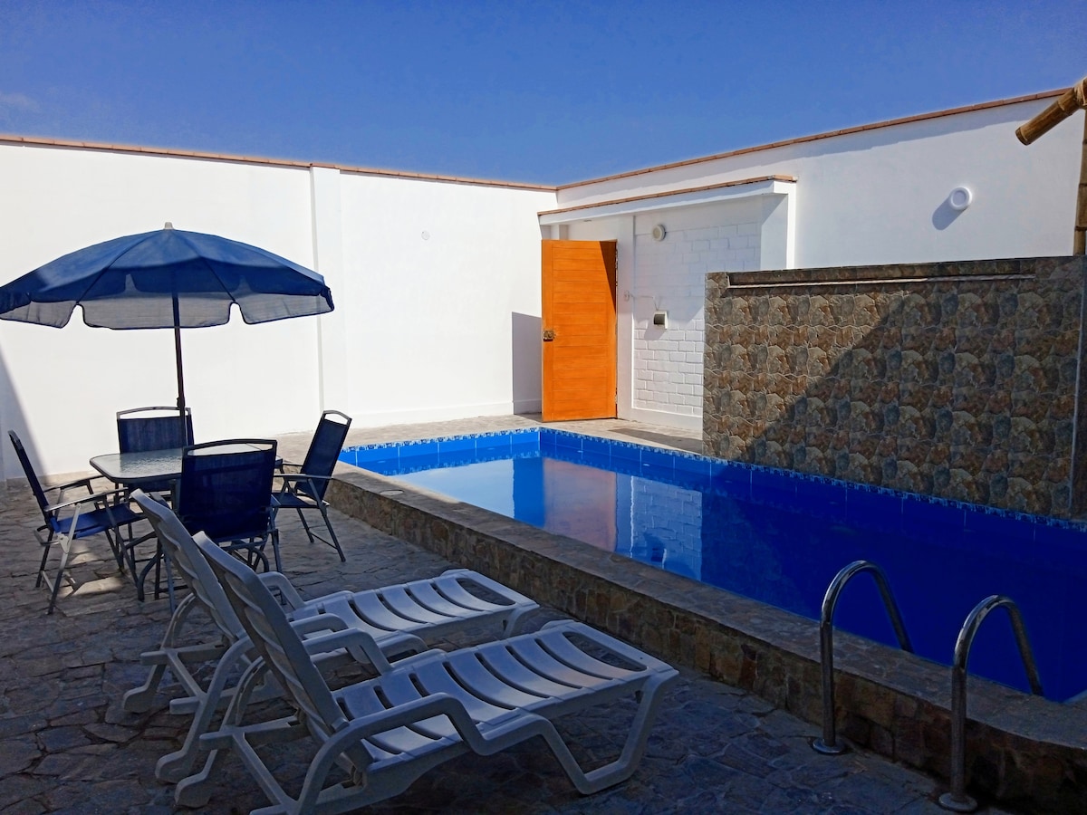 Modern and bright, luxury house, with beachfront pool, just steps away from the ocean. Housekeeper and private Chef included! Located in one of the most beautiful natural reserves in South America (Paracas) - a beach oasis in the middle of the desert, surrounded by a national parks and centuries of pre-Inca history, and 1 hour away from the Nazca lines! 3 spacious bedrooms with en-suite bathroom and closet, TV room, modern kitchen, laundry room, and a bedroom for service staff, a true gem!