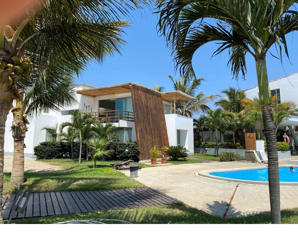 A pasos del mar. Arquitectura imponente inspirada en los templos preincas y su tecnología, en el vuelo de la aves y el viento, en su diálogo eterno con el sonido del mar. Combina una estructura moderna con acabados naturales: madera, piedra, eucalipto, bambú y troncos vivos; rodeada de un jardín tropical. Ubicada en Vichayito, colindante a Máncora, votada la mejor playa del Perú.