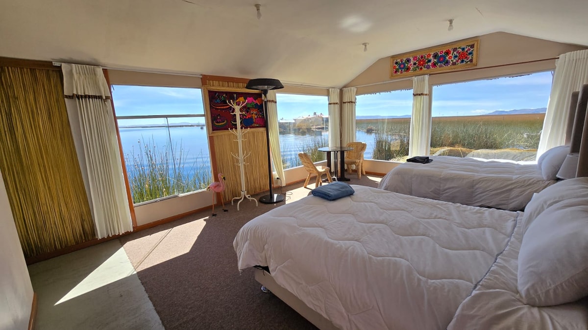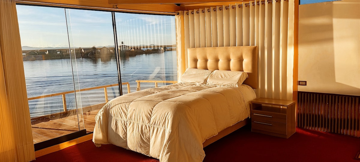 Lucsay Titicaca Lodge, es una isla flotante ubicada en la comunidad Uros ( Lago Titikaka), la tarifa incluye Alojamiento, (desayuno simple," , guia local, servicios básicos (papel, toalla jabon liquido) en la estadía ofrecemos diferentes tipos de experiencias únicas como (la caza de aves, pesca, demostración cultural, recolección de plantas acuáticas (totora), enseñanza de nuestras idiomas nativas, relatos históricos mitos y leyendas de nuestra cultura todo en compañía de su servidor).