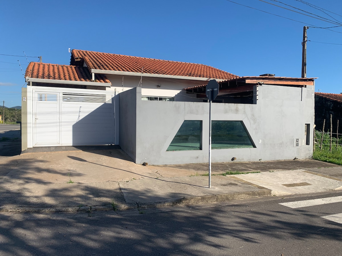 A casa conta com, sala e quarto integrados, banheiro, cozinha americana com todos os utensílios para preparo de refeições ou um churrasco, na área externa temos uma churrasqueira, pia e mesa de quatro cadeiras, uma piscina pequena (1 metro de profundidade), garagem fechada grande( 30m²) porem só cabe um carro devido a lavanderia no mesmo espaço, e jardim com plantas e arvores frutíferas, tenho um aquário e um viveiro no quintal que cuido todos os dias pela manhã.