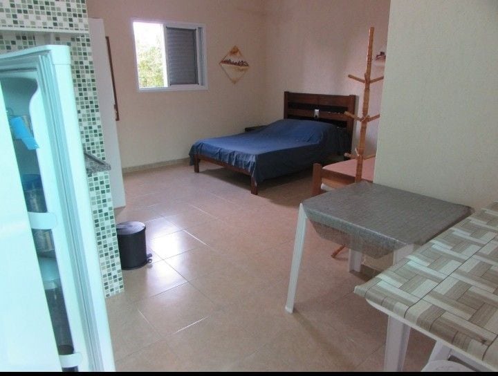A casa conta com, sala e quarto integrados, banheiro, cozinha americana com todos os utensílios para preparo de refeições ou um churrasco, na área externa temos uma churrasqueira, pia e mesa de quatro cadeiras, uma piscina pequena (1 metro de profundidade), garagem fechada grande( 30m²) porem só cabe um carro devido a lavanderia no mesmo espaço, e jardim com plantas e arvores frutíferas, tenho um aquário e um viveiro no quintal que cuido todos os dias pela manhã.