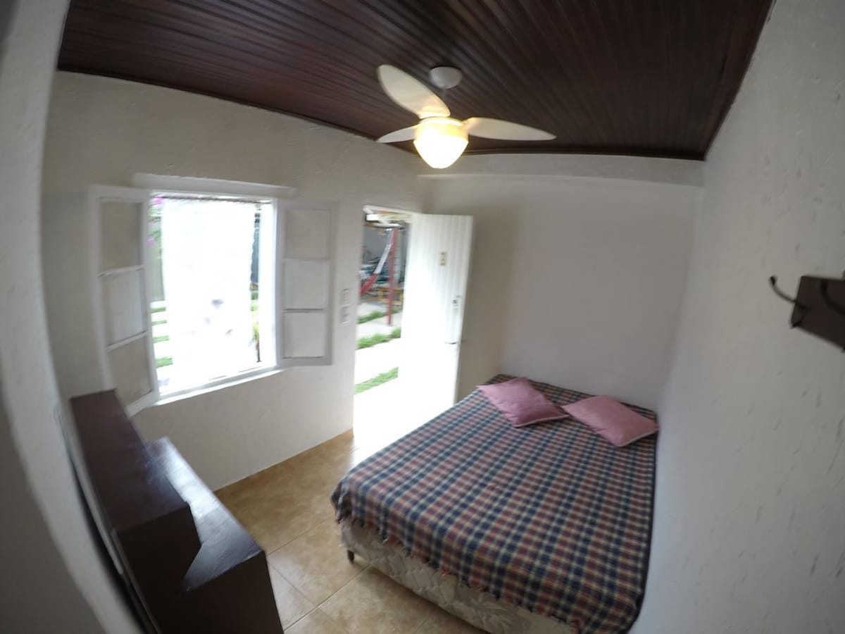 1 Suíte com Área de Churrasqueira Completa e Privativa , Suíte com 2 Camas de Casal, tv LCD , ventilador de teto, Wi-Fi. Área de Churrasqueira tem Chuveirão de Praia , Sofá, fogão, geladeira, armário com utensílios de cozinha, churrasqueira, forno e fogão a lenha, espaço e a suíte privativo ...somente a Garagem compartilhada.4 Quadras em linha reta da Praia , lugar tranquilo e Famíliar, comércio e lojinhas .