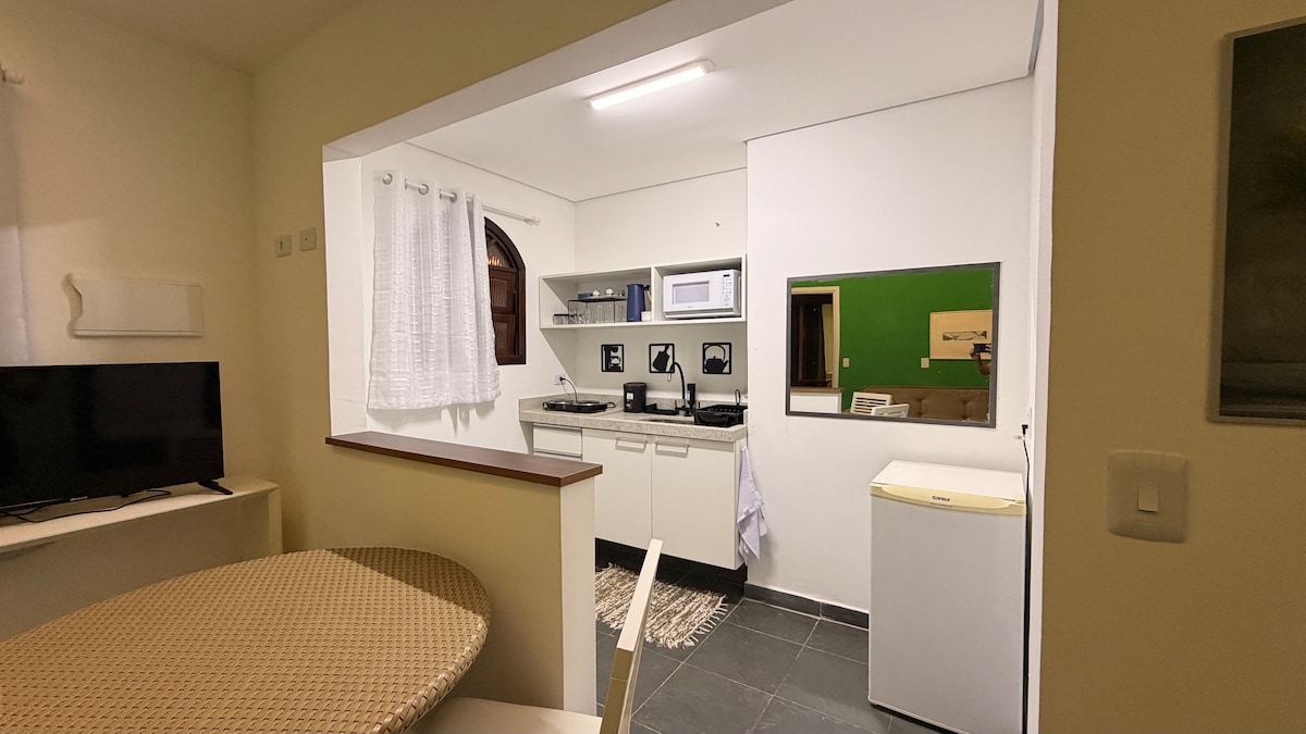 Apê com garagem, frente mar, um quarto, sala, cozinha, banheiro, tv a cabo, cama de casal, duas bicamas, ducha higiênica, geladeira, fogão, microondas, ventiladores de teto. Portaria 24h, elevadores, wifi só no térreo, centro de Peruíbe, perto mercados, comércio para compras. Acomoda até 6 pessoas com garagem para 1 carro. Domingo check in após 18h. Sexta check out 8h. Segunda check in as 12h.