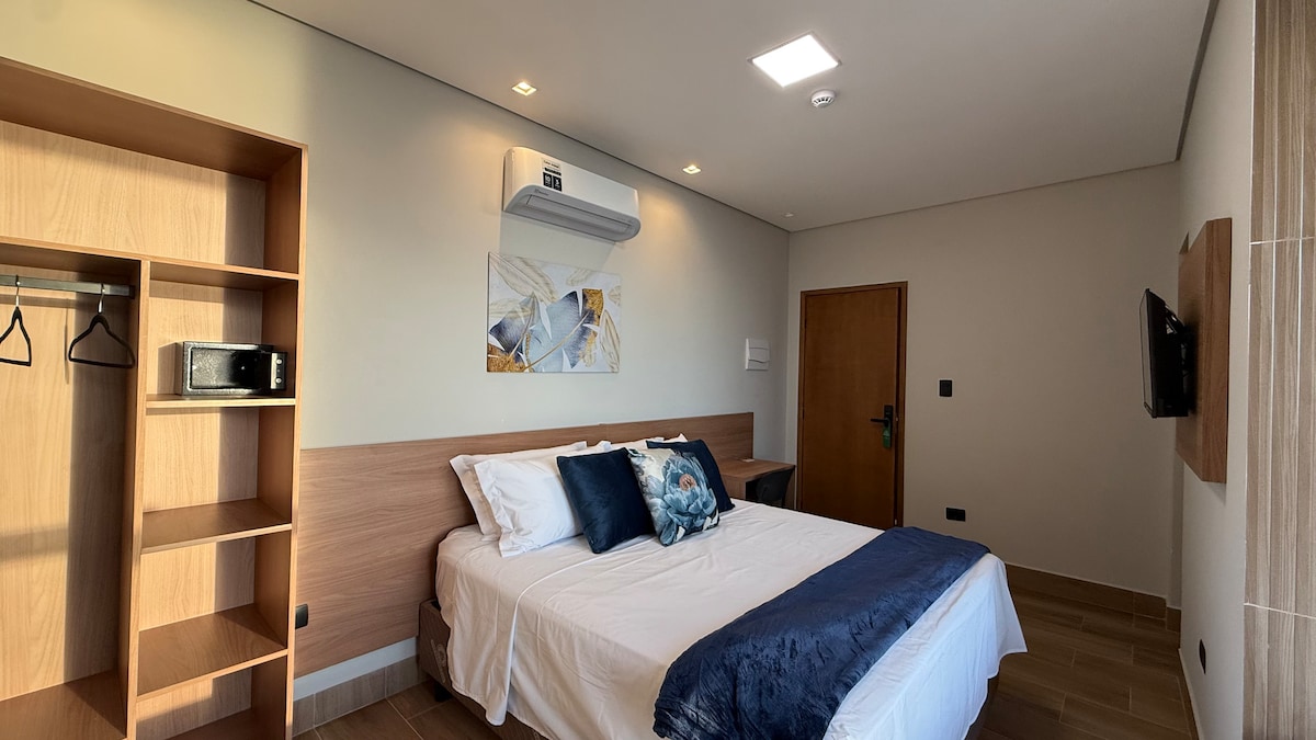 Apartamento térreo novo, da Debora, super host e preferida dos hóspedes, localizado no coração de Peruibe, a 450 m da praia, próx de padarias, mercado, restaurantes, lojas, o studio "Refúgio da praia II" foi feito para você passar dias de lazer. - Sala, cozinha e quarto integrados - Equipamentos de cozinha: microondas, frigobar, cafeteira, sanduicheira, fogão elétrico, filtro - Wi-Fi e Smart TV - Home office - Ventiladores móveis - Ducha Externa - Chuveiro Externo - Atrás da clínica veterinária