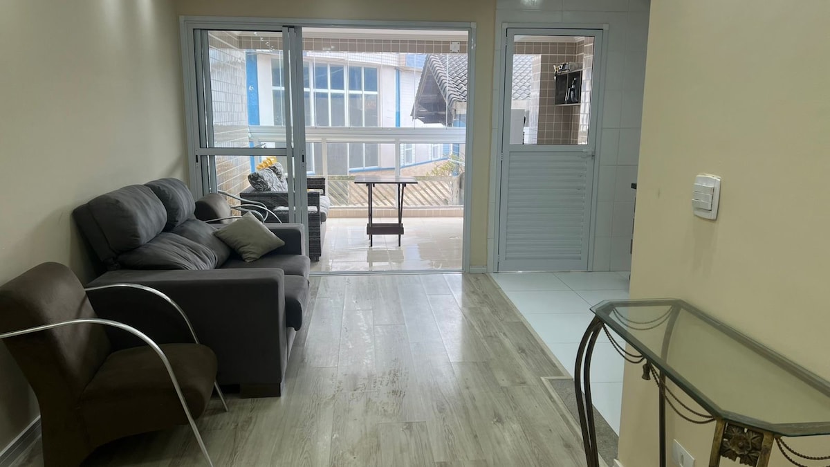Apê com garagem, frente mar, um quarto, sala, cozinha, banheiro, tv a cabo, cama de casal, duas bicamas, ducha higiênica, geladeira, fogão, microondas, ventiladores de teto. Portaria 24h, elevadores, wifi só no térreo, centro de Peruíbe, perto mercados, comércio para compras. Acomoda até 6 pessoas com garagem para 1 carro. Domingo check in após 18h. Sexta check out 8h. Segunda check in as 12h.