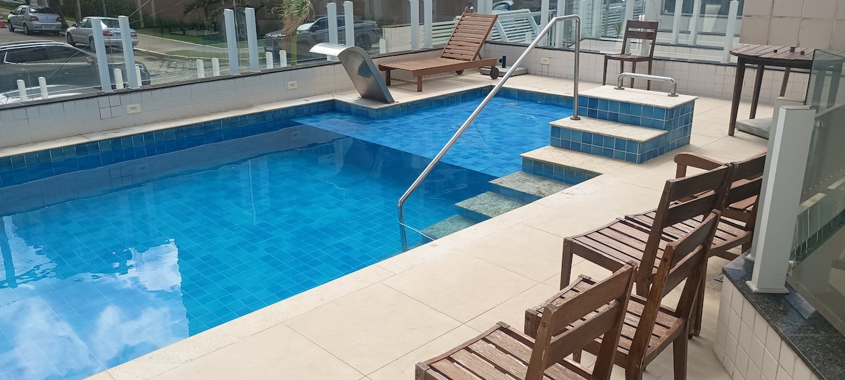 Flat p/ Família até 8 pessoas a 250mts da praia totalmente protegido c/ tela mosquiteiro c/ 1 suíte c/ cama de casal e ar condicionado, 1 dormitório c/ cama de casal e beliche, 1 quarto compacto c/ treliche, mais 2 colchões de solteiro avulso, amplos terraços, sala Living c/ wifi e stremming, terraço com churrasqueira, 2 TV's a cabo/Sinal aberto, um excelente local c/ uma belíssima vista panorâmica e ótima ventilação, garagem coberta para 2 carros, segurança 24Hs, acesso ao Flat por elevador..