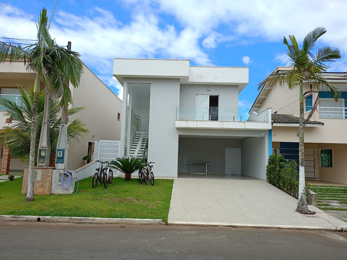 Linda casa de 630 m2 com piscina privativa, em condomínio fechado com muita segurança e ampla infraestrutura de lazer, a 1 km da praia. Casa equipada com utensílios de cozinha, três camas de casal Queen, duas de solteiro e dois colchões avulsos novos, sala com Smart Tv a cabo e internet. Ar condicionado em todos ambientes, churrasqueira com todos acessórios, piscina com prainha, cadeiras de praia e guarda sol a disposição, para o seu conforto e diversão. Vaga para quatro carros na garagem.