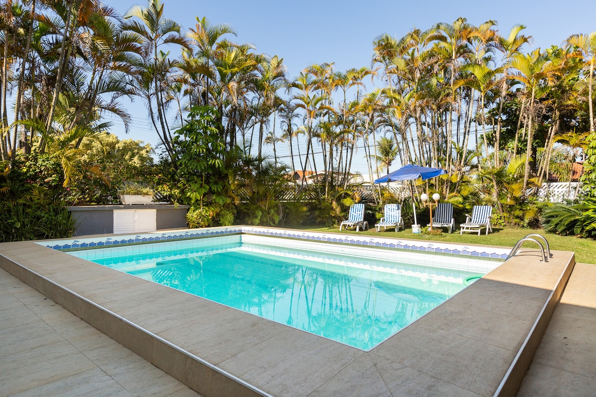 Raridade, 250m da praia, 550m2, piscina, churrasqueira, 5 dorm, 3 banheiros, 1 lavabo, vestiário, WIFI, TV a cabo, Espaço de Convivência, varandas com redes, jardins, amplo espaço c/ mesas, cadeiras, espreguiçadeiras. Salão de jogos c/mesa de sinuca,tênis de mesa e pebolim. Garagem p/ 4 carros. Cerca elétrica, Segurança 24h. Duas câmeras na parte externa para segurança dos hóspedes e da casa. SÓ PARA FAMÍLIAS. Feirinha. Quiosques Outras praias: Guaraú c/Boulevard, Barra do Una, Cachoeiras.