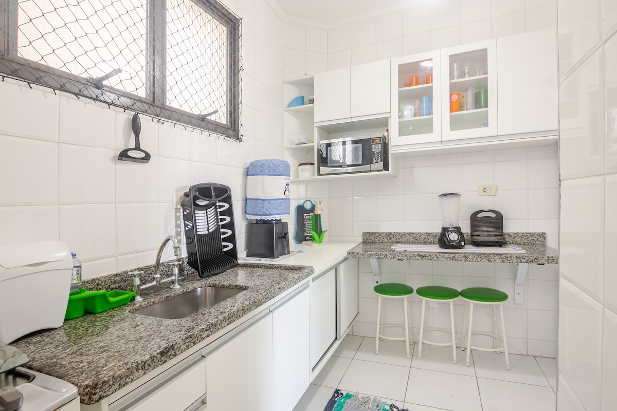 Apê com garagem, frente mar, um quarto, sala, cozinha, banheiro, tv a cabo, cama de casal, duas bicamas, ducha higiênica, geladeira, fogão, microondas, ventiladores de teto. Portaria 24h, elevadores, wifi só no térreo, centro de Peruíbe, perto mercados, comércio para compras. Acomoda até 6 pessoas com garagem para 1 carro. Domingo check in após 18h. Sexta check out 8h. Segunda check in as 12h.
