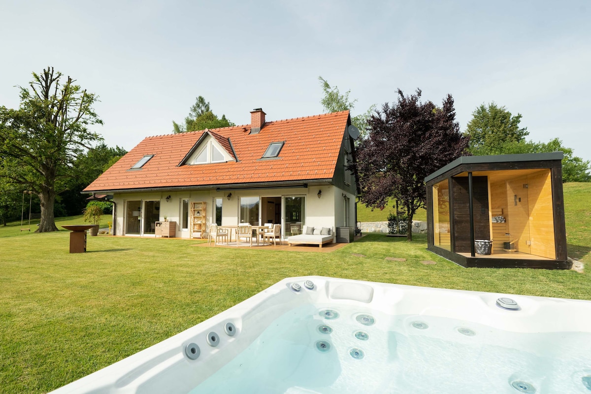 Experience unforgettable days in our charming holiday cottage on the Slovenian side of the South Styrian Wine Road. Surrounded by meadows and forests, it offers the perfect retreat for nature lovers and those seeking relaxation. Enjoy evenings on the terrace with views over the hills, unwind in the luxurious sauna and hot tub. Nearby, you'll find wine taverns with excellent wines and top-notch restaurants.