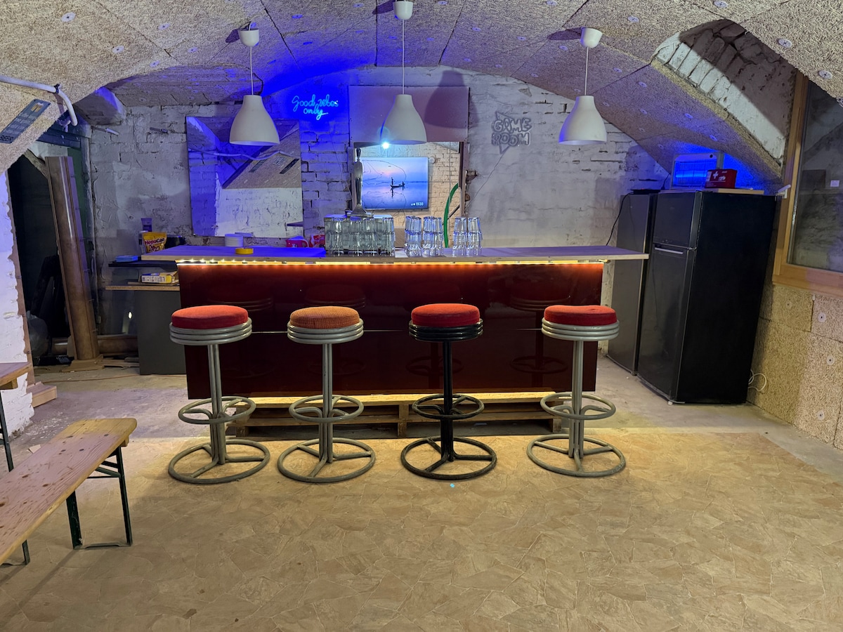 前酒吧6,配备台球桌、飞镖、啤酒龙头,可容纳16人
