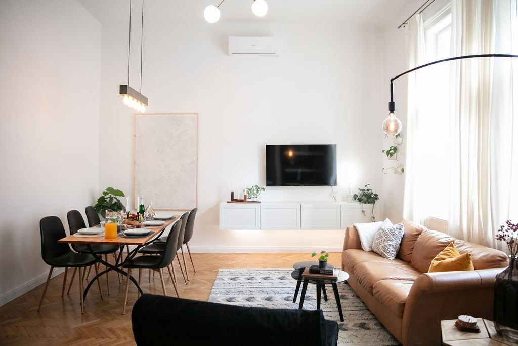 Look out over a leafy town square and the historic buildings of District V from a wall to wall window that gives the apartment its hip and airy feel. There's a calming simplicity to the interiors, with fun highlights in an array of comfy cushions. Explore the city on foot and find easy airport transport links. The Hungarian Parliament, Synagogue, and Deák Ferenc square are a short walk. There are restaurants aplenty, and the cafe in the square opposite is great for a coffee, beer, or snack.