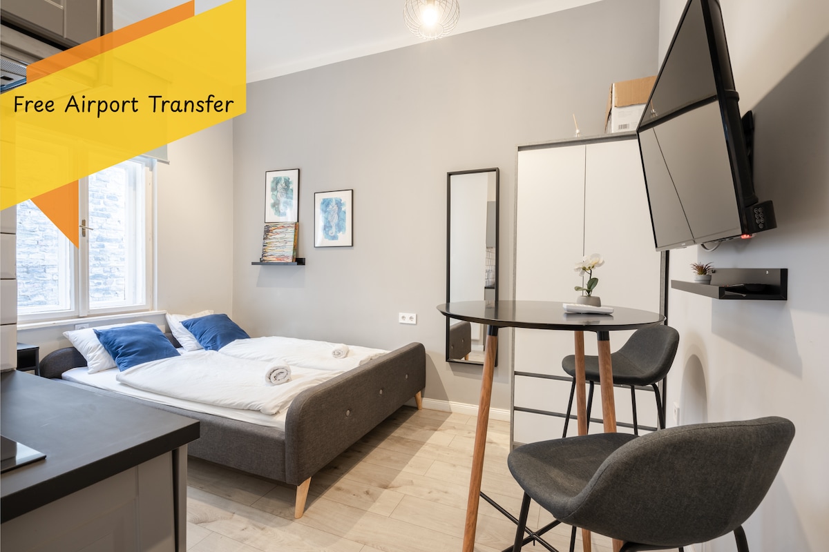 Wake up in a bright top-floor (5th) studio by the Danube, where sunlight fills the space and a quiet, tree-lined street sets a calm tone. Stroll to Parliament in five minutes, grab coffee and fresh pastries at a cozy café, or relax on nearby Margaret Island. Set in a renovated historic building with an elevator, the studio offers fast Wi-Fi, A/C, and peaceful courtyard views - perfect for slow mornings, city adventures, or remote work in the heart of Budapest. We can’t wait to welcome you!