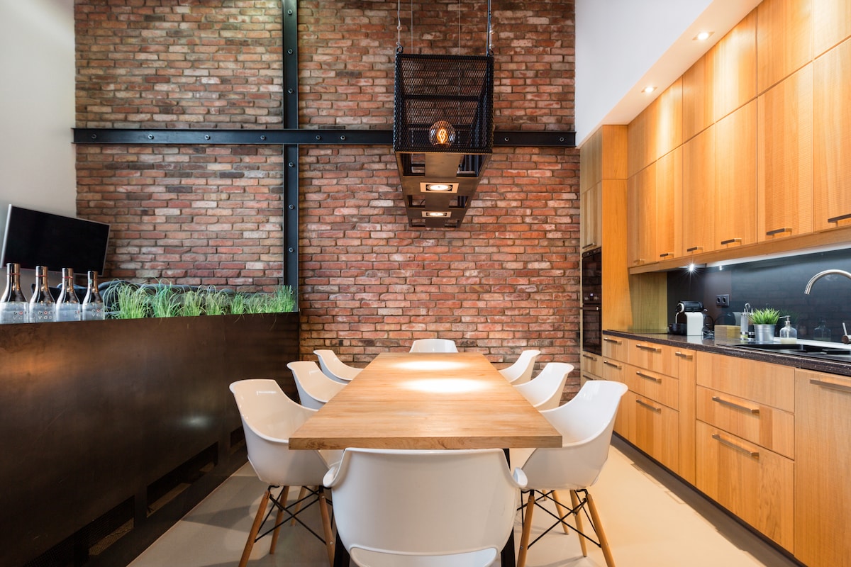 Have you ever dreamed about an artist's extravagant studio? Feel the vibe and try a famous Hungarian painter Lajos Vajda's renewed studio loft, facing the city biggest park Városliget. Park for free in our underground garage and cook in our kitchen with striking wood cabinets and exposed brick. A factory-chic chandelier hangs above a modern dining table while a living area basks in natural light from industrial windows. Beautifully designed in 100 -years-old house, near to Heroes square.