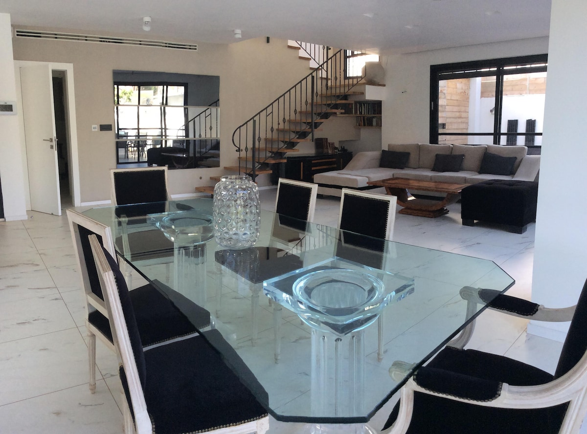 This beautiful 5 room Penthouse is located 5 minuets drive from the main highway that crosses Israel from north to south. It is 15 minuets drive to the beach, 20 to Tel Aviv and 45 min. To Jerusalem. It has 4 double beds a beautiful 40 sqm terrace. A large living room & stunning view. Kitchen is fully equipped including an espresso machine, Guests can enjoy the peaceful country side & in the same time be within reach of Tel aviv. Best restaurants and supermarket, are within 5 minuets walk