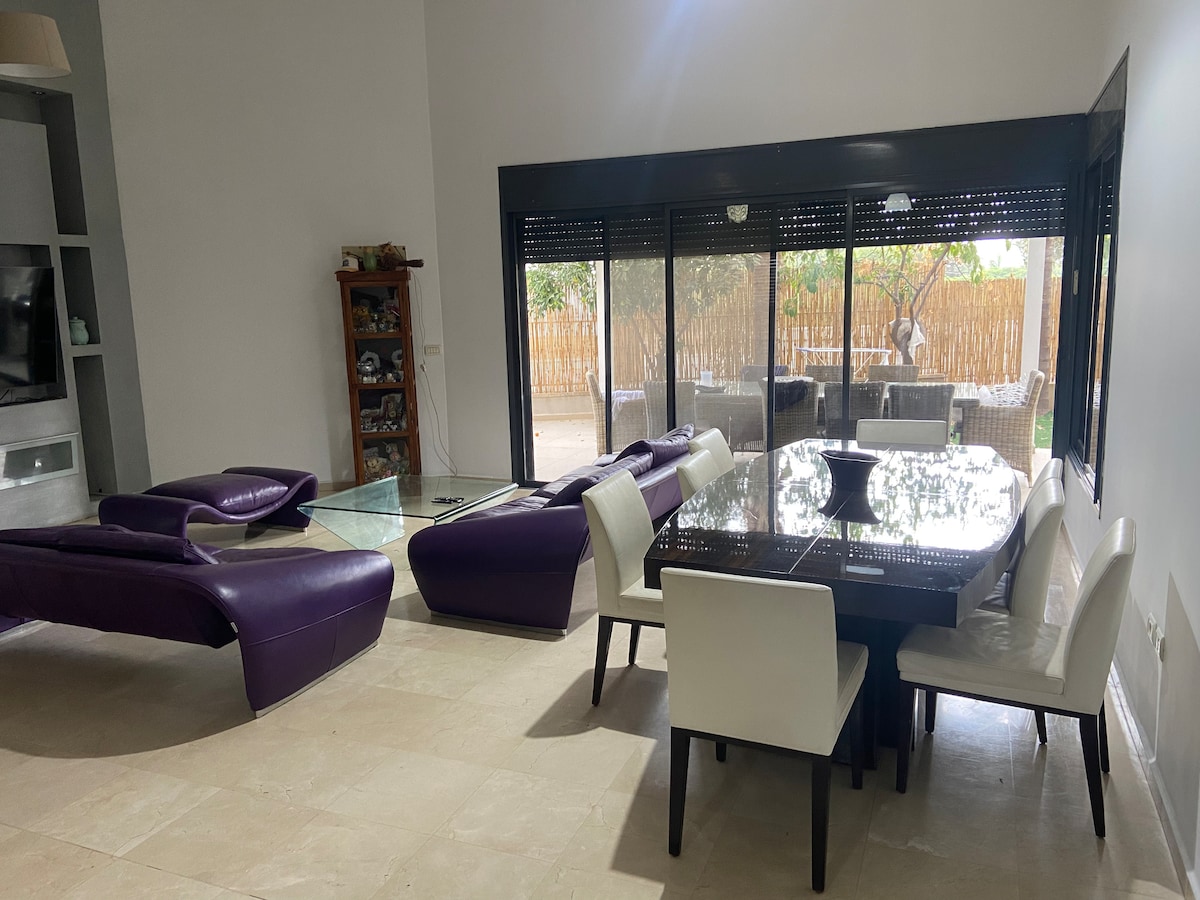 Welcome to Yoav & Yana's charming villa. While they're traveling, they're happy to host you. The villa spans over 1000 sq m. 10 min from the beach, 20 min from TLV. Quiet neighborhood, walking distance of shops, cafes. Luxurious 60 sq m pool, 4BR, safe room, Wi-Fi, fully equipped kitchen/fantastic oven! Gas barbecue, ping pong table, plenty of shaded cozy corners in the garden. A perfect vacation awaits you! You can book together with the vacation apartment to accommodate additional guests.