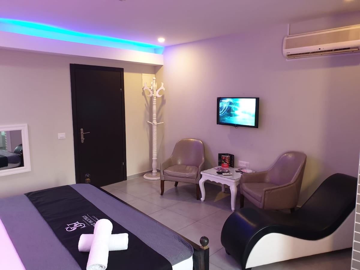מקום האירוח גדול מאוד בשכונה שקטה משקיפה לפארק הדירה מעוצבת ומושקעת קומה 7 כל הקומה ללא מדרגות, מרפסת ענקית עם פינות ישיבה, פינת מנגל, ג׳קוזי, מיטות שיזוף, מטבח מאובזר ,חדר שינה גדול עם מקלחת ושירותים ויציאה למרפסת סגורה עם פינות ישיבה, טלוויזיה 85 אינץ׳ וחדר כושר. פלוס שני חדרי שינה נוספים וספות שאפשר לישון עליהן. יש בדירה כל מה שצריך. גם למשפחות של 5-7 נפשות (יש ממד בדירה)