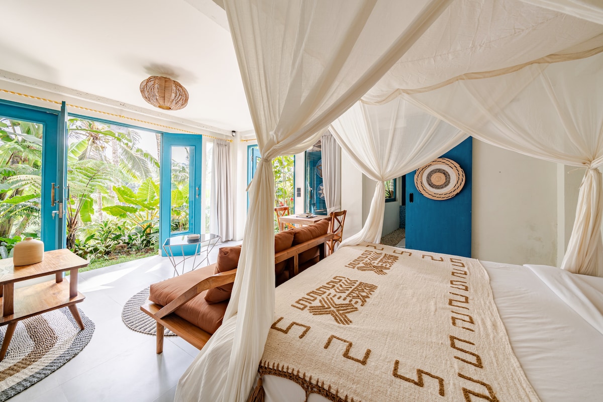 Private one bedroom villa with private view,where you can see nice view from the bathroom,bedroom and from the kitchen,the kitchen with full equipment ready to cook,walking distance to the waterfall,located in nature and nice vilage in bangli,fresh air and less polution,super nice view, Enjoy complimentary soft drinks, fresh eggs, instant noodles, coffee, and tea during your stay.