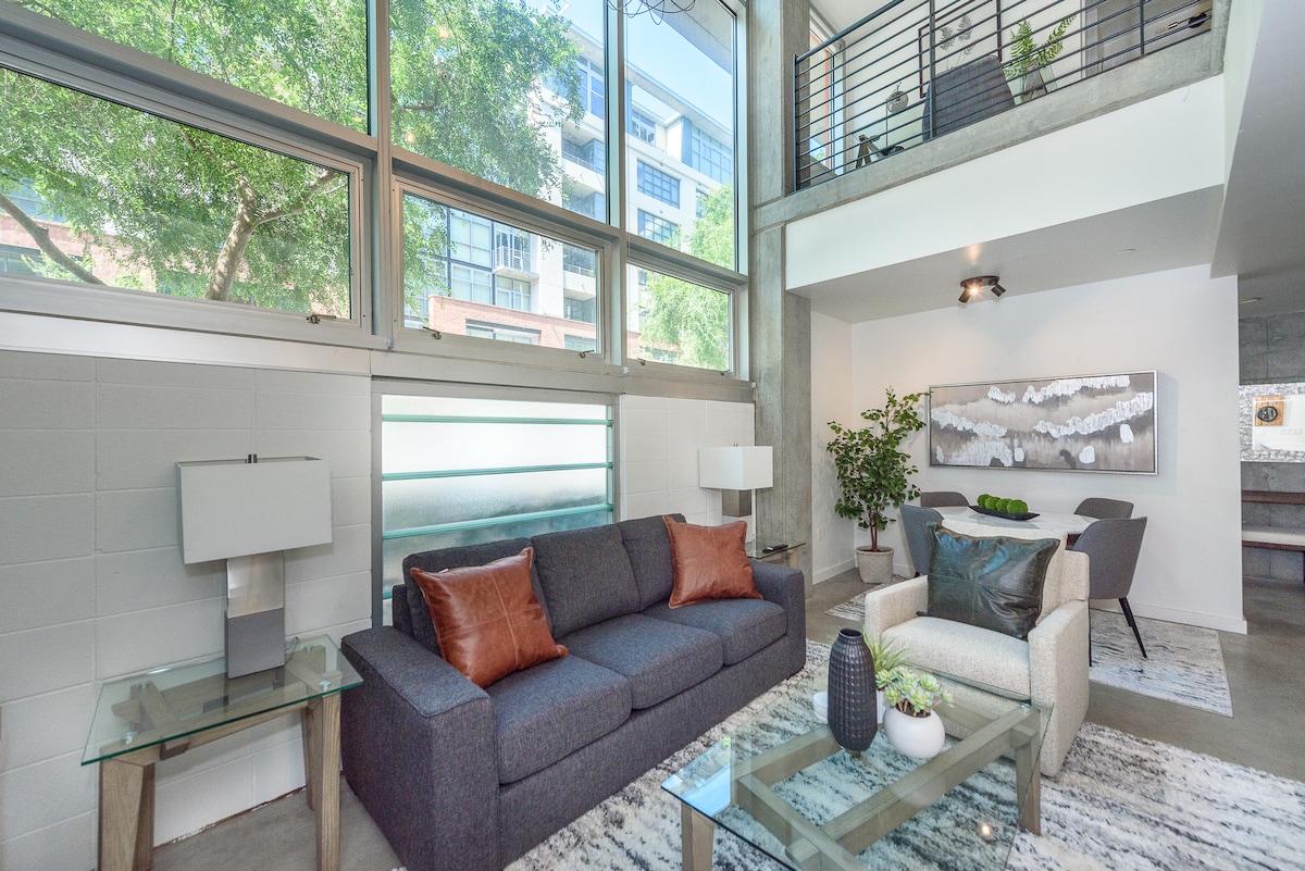 Stunning industrial loft in the heart of downtown San Diego! This stunning 3 story Townhouse is blocks from Gaslamp and offers beautifully appointed modern furnishings and luxurious accommodations. The 1st floor features a private bedroom with full bath. On the 2nd level is the main living area, which boasts 20-foot ceilings with a huge view window, dining for 8, and a private balcony. The 3rd level of this chic home opens to a lofted master suite with two Queen beds and full bath.