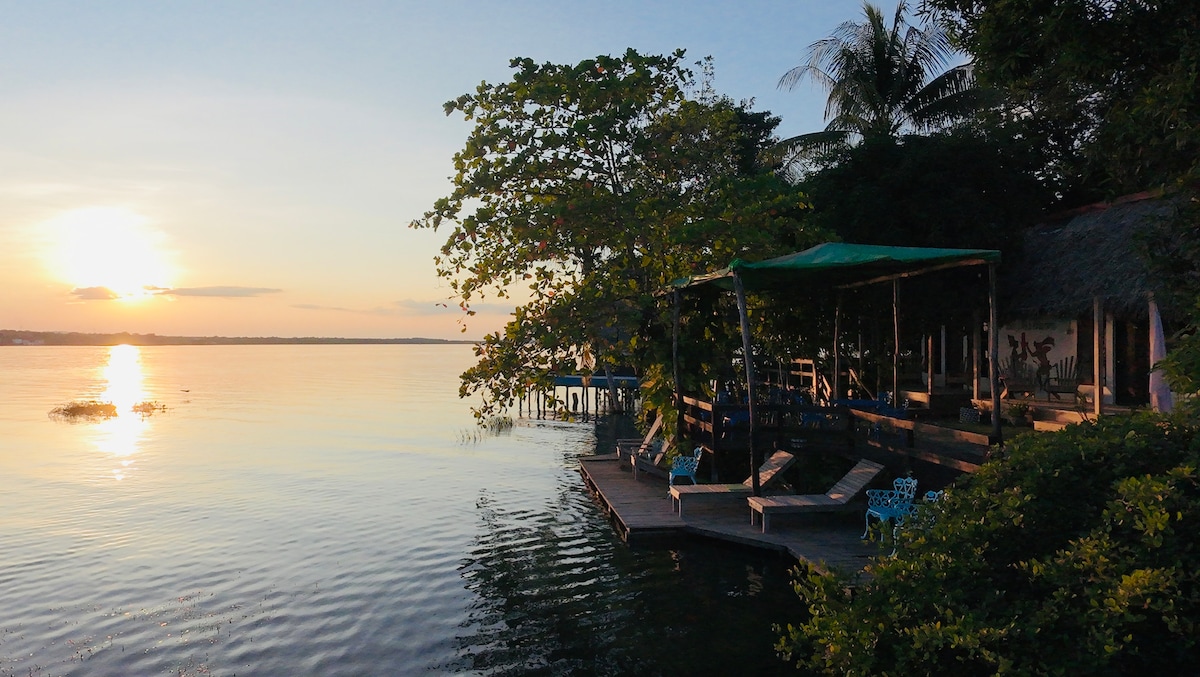 Disfruta una experiencia única frente al majestuoso lago Petén Itzá. Nuestra habitación privada para 6 personas combina comodidad, aire acondicionado y vistas increíbles. Incluye acceso gratuito a lancha para check-in/out, kayaks, paddleboards y bicicletas. Perfecto para relajarte, conectar con la naturaleza y explorar maravillas como Tikal o Yaxhá desde un lugar lleno de buena vibra.