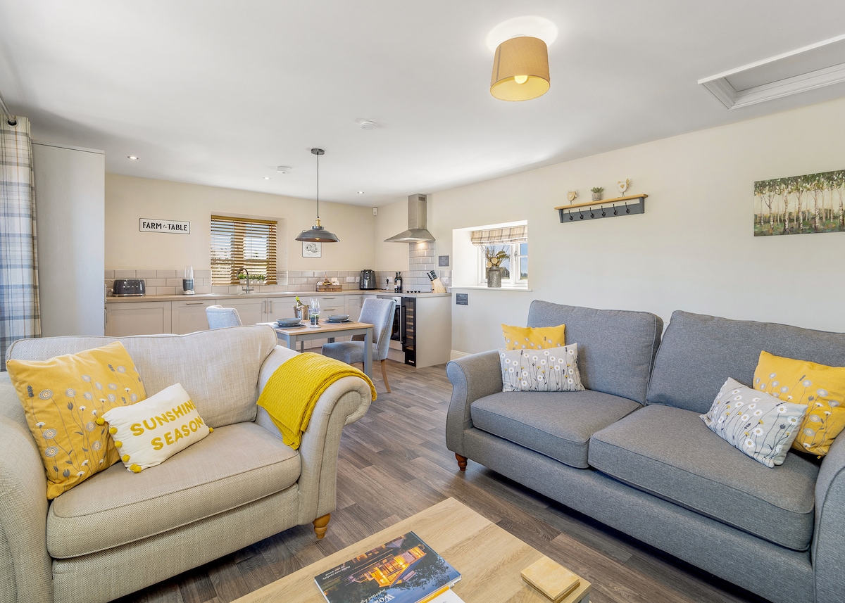 A fully refurbished self contained loft apartment We can offer either super king or twin beds dependant upon your requirements (Please confirm upon booking) Private staircase, decked balcony, open plan living, aircon/heating, TV, armchairs & breakfast bar/table. Kitchen includes combi oven, ceramic hob and fridge . Bedroom offers aircon/heating, TV and double glazed window looking onto open views. Modern en suite bathroom includes a spacious walk in shower fresh towels & basic toiletries.