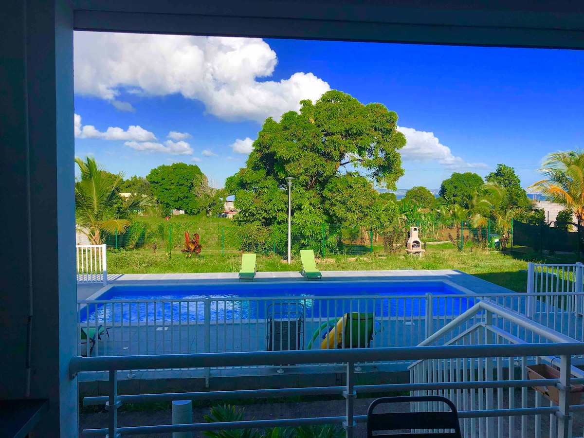 Au cœur de la Guadeloupe 🦋 des racines et des ailes… 🏘️ L’appartement comprend : - une chambre climatisée (avec SDB attenante🚿) disposant d'un lit 160x200 - un salon avec canapé convertible de 140x190 🛏️ - une grande terrasse avec vue sur la piscine, entretenue 2 fois/semaine 😎 - une cuisine équipée 🍽️ - des WC séparés 🚻 - une place de parking attribuée 🅿️ … des extérieurs très agréables ☀️🌺 N’hésitez plus ! Restrictions : Espace non-fumeur, Pas d’animaux autorisés, 1er étage sans ascenseur