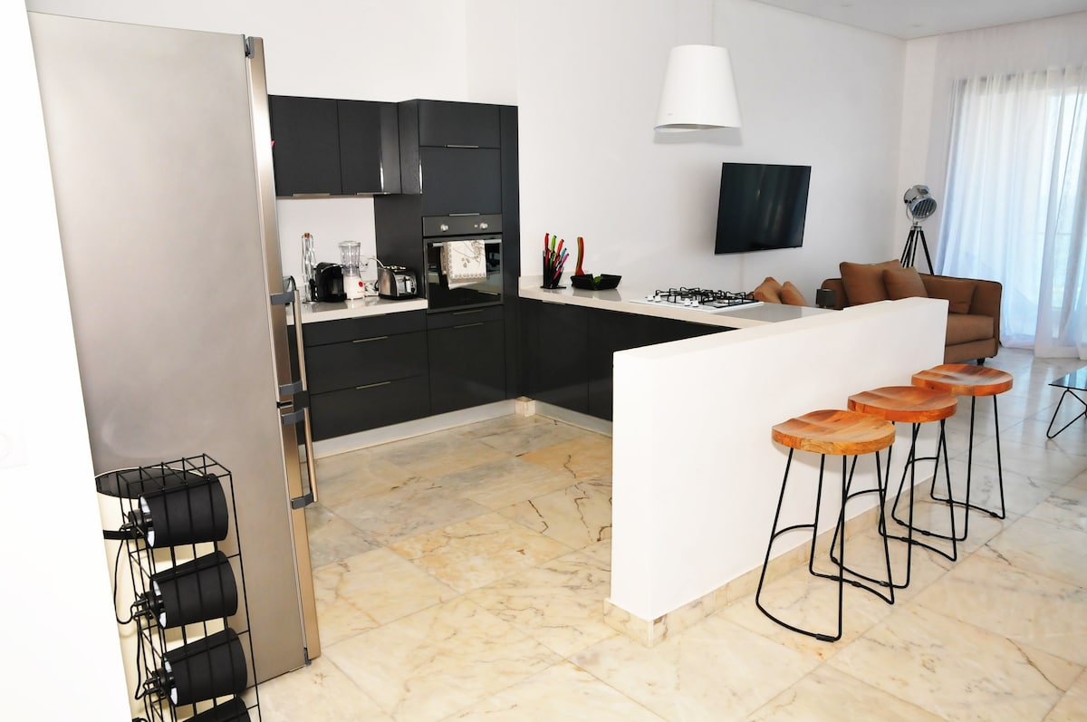 Modern apartment with all the amenities of the KALIA Zone de Captage building. One bedroom and two full bathrooms (one en suite). Well-equipped kitchen. Terrace. Hotel-quality mattresses, linens, and towels, as well as kitchen and bathroom essentials. Free access to the gym and swimming pool. Building with 24-hour security and covered parking. Stays of one week or more include cleaning and sheets and towel changes.